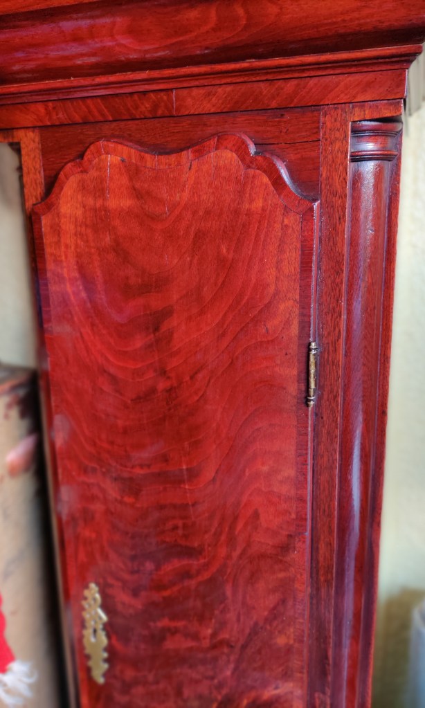 Here’s a mid Georgian Walnut Longcase. the dial as I recall is 12″, I’ll confirm that soon. Shown here missing it’s feet, and as I got it, then as I started to tidy it up, removing the mouldy surface and what was left of the polish using an old fashioned reviving fluid, one of the ingredients being linseed oil. This really helped to bring out the colour, and although I favor old sunbleached walnut, sometimes the surface has gone beyond redemption in places. The sound fret was a later repair but needs to be redone as it’s not a good example! So, if you are interested in this, or seeing more of my clocks, please let me know, and thanks for reading this. Regards, Andy.